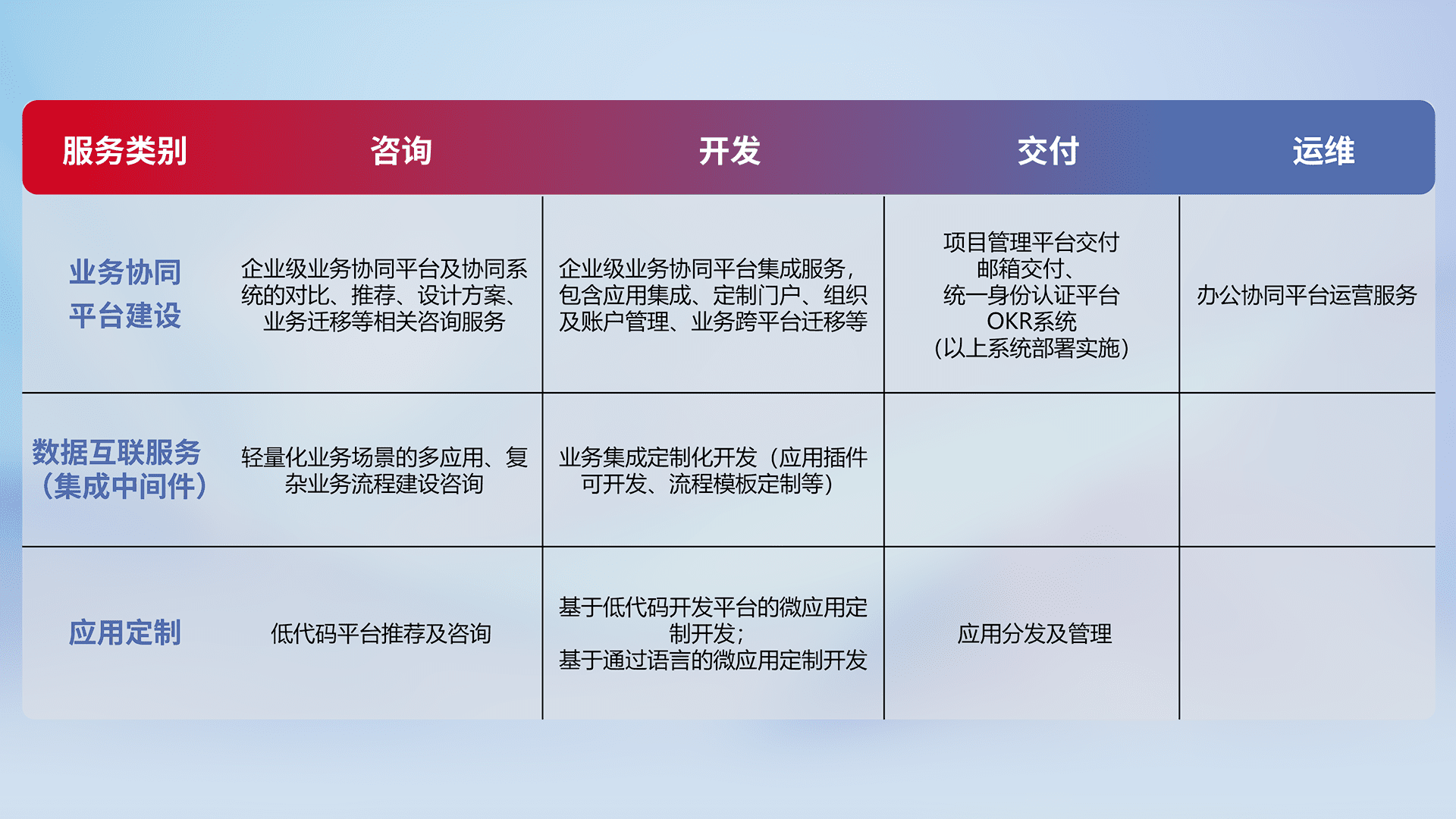 针对钉钉、、、、企微、、、IDaas等平台级产品提供产品的规划、、、方案、、交付、、、定制化开发等服务,,实现如统一协同办公、、、智能客户服务、、混合会议管理、、、、智能数据查询、、等业务场景,,,,实现数字化转型。。