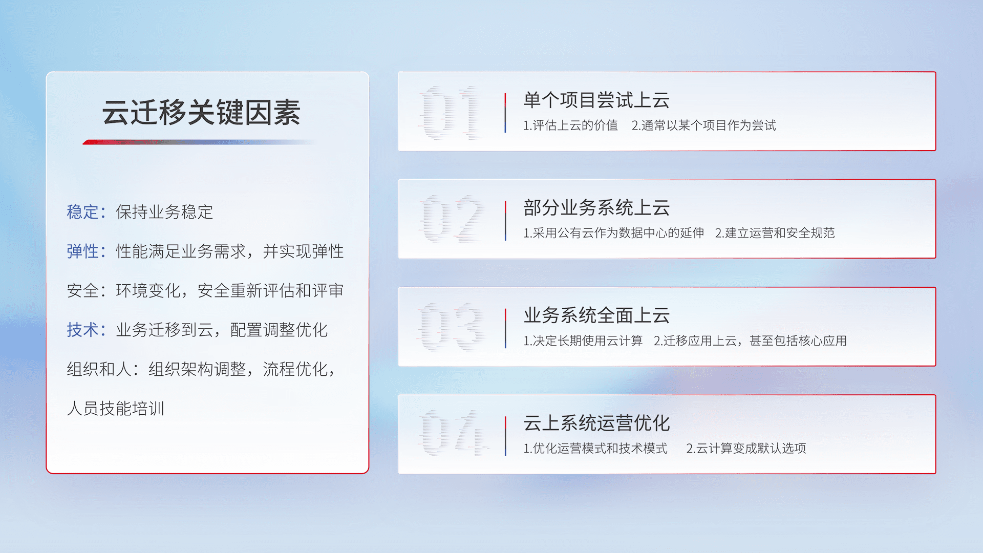 结合实际业务,,从规划设计、、云平台选型、、、云原生改造、、、、数据迁移、、、集成交付,,迁移全过程为客户识别最佳上云路径,,,做好风险识别管理,,,,设计网络架构、、、、身份权限、、安全审计合规、、、操作审计、、日志审计、、、、监控告警策略、、、多站点容灾设计等,,,对云上基础设施进行整体规划,,,提升IT治理水平,,以满足弹性、、、、高可用、、高性能的需求。。。。