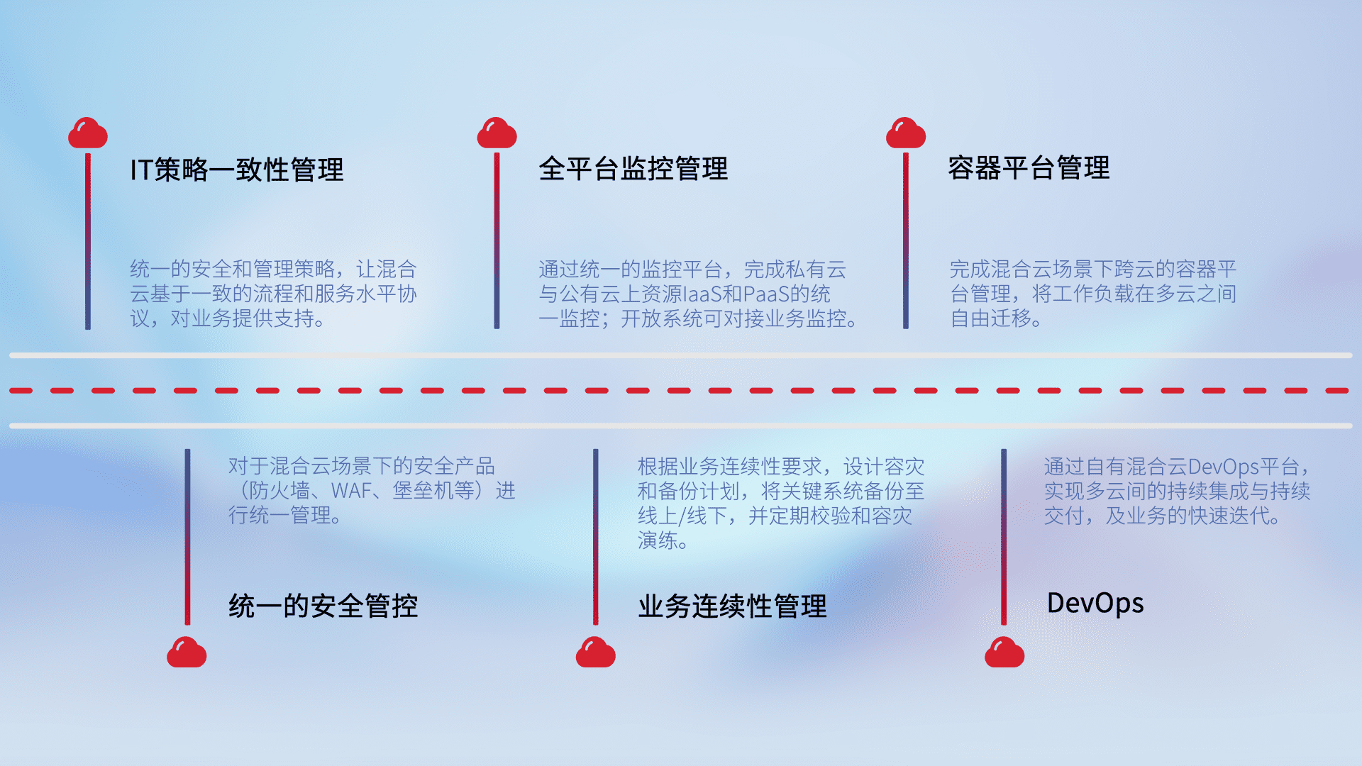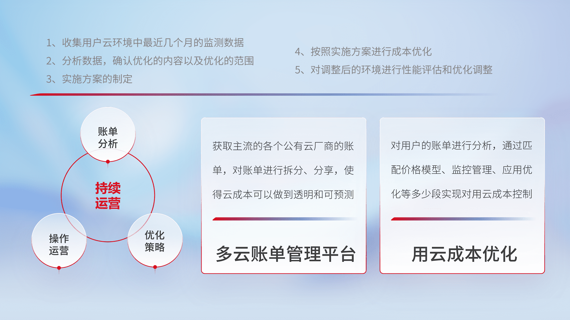 通过多云纳管,,以统一的资源数据模型把客户的云资源进行抽象和封装,,,,进而实现对多云资源的统一操作,,,,保障云资源管理的可靠性、、稳定性与可用性。。。。量身定制化运维内容,,配置、、开发运维、、补丁管理、、备份、、监控、、认证和访问管理、、、、审计和日常巡检等,,,,保障在用云过程中的可靠度,,,稳定度以及高可用率。。
