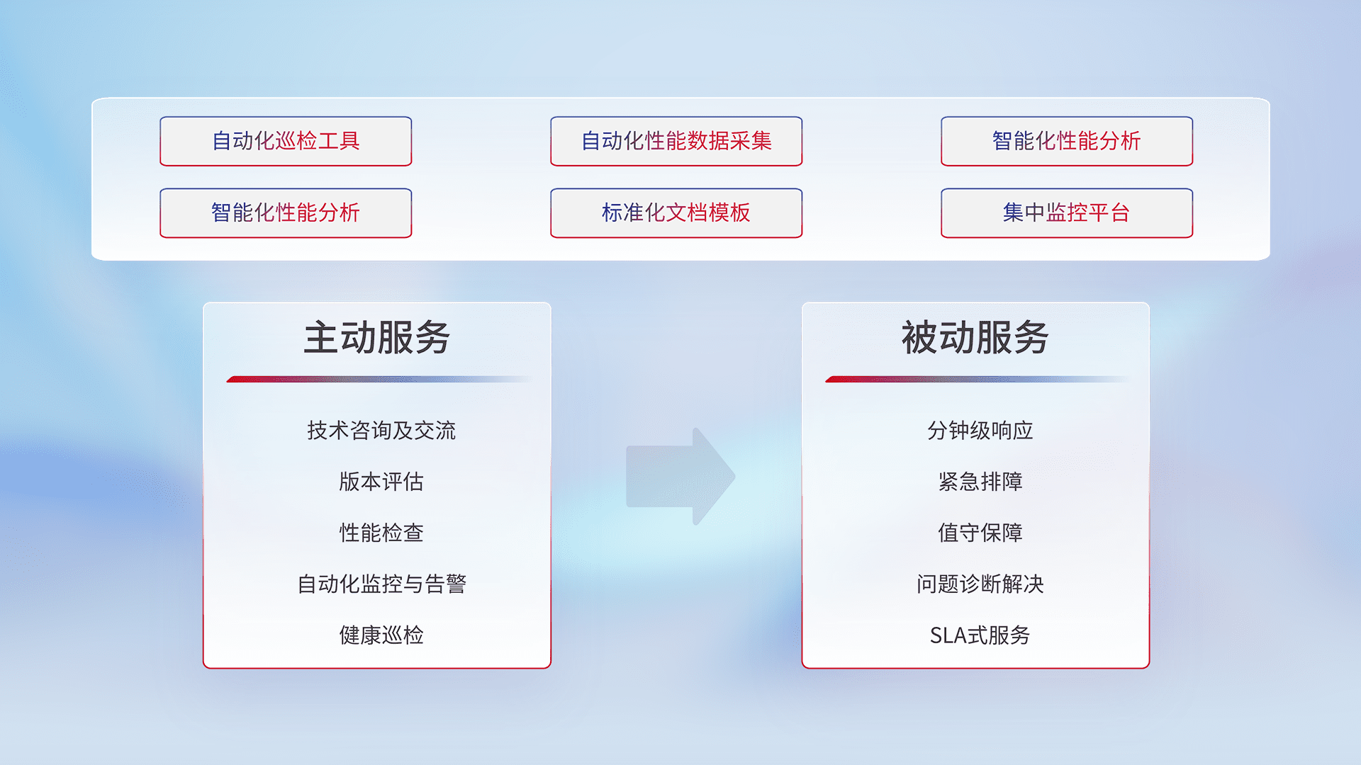 智能化工具和标准化文档,,,,保障服务质量,,,,提供主动服务(包含技术咨询、、、、版本评估、、、性能检查、、、自动化监控与告警、、、、健康巡检)和被动服务包含(分钟级响应、、、、紧急排障、、、、值守保障、、、问题诊断解决、、、、SLA服务)。。。。